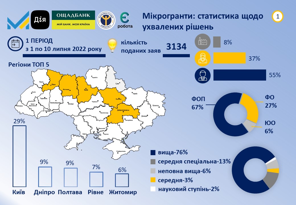 Упродовж 1-10 липня до центрів зайнятості України підприємці-початківці та ті, хто вже мають досвід підприємництва, подали 3134 заяви для отримання мікрогрантів.