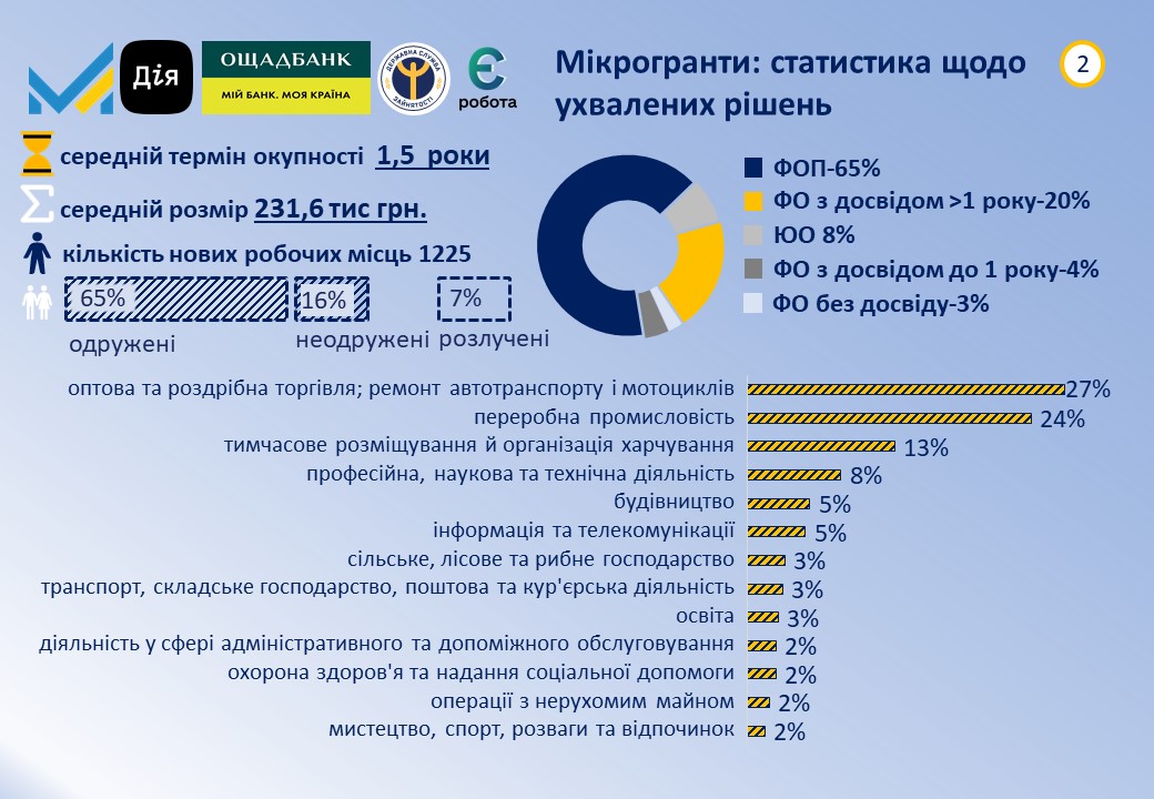 Середній розмір наданих коштів для створення чи розвитку бізнесу - понад 231 тисяча гривень. Тематика бізнес-планів така: на першому місці - оптова та роздрібна торгівля, ремонт автотранспорту та мотоциклів, далі - переробна промисловість, тимчасове розміщення та організація харчування.
