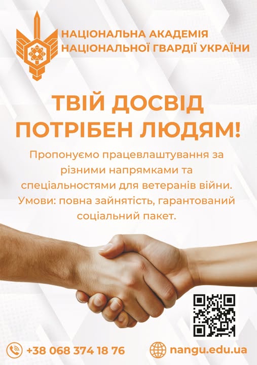 До уваги військовослужбовців системи МВС України, ветеранів війни, які визнані військово-лікарськими комісіями непридатними до військової служби та осіб з інвалідністю! Для вас у Національній академії Національної гвардії України відкриті вакансії за різними напрямками та спеціальностями.