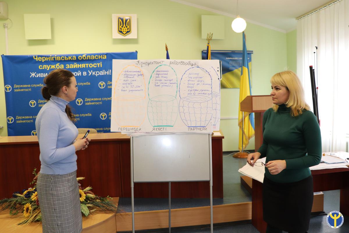 Другого дня начальники відділу організації надання послуг роботодавцям Людмила Лисобикова та відділу організації профорієнтації Марина Кривопала навчали присутніх налагоджувати контакти з роботодавцями та професійно просувати послуги служби зайнятості. За допомогою вправ та мозкового штурму присутні проаналізували очікування від співпраці, потреби і побоювання роботодавців і консультантів роботодавців, в чому єдність і протиріччя їх прагнень, визначали особливості надання послуг роботодавцям залежно від їх типу, бар’єри ефективної взаємодії. Також учасники тренінгу вчилися вести ділові переговори, оперативно виявляти потребу роботодавця та його очікування від служби зайнятості, переконувати їх та мотивувати, долати суперечки, реагувати на критичні зауваження, ставити питання і відповідати на них, будувати стратегію укомплектування вільних робочих місць, зокрема й на засадах рекрутингу.