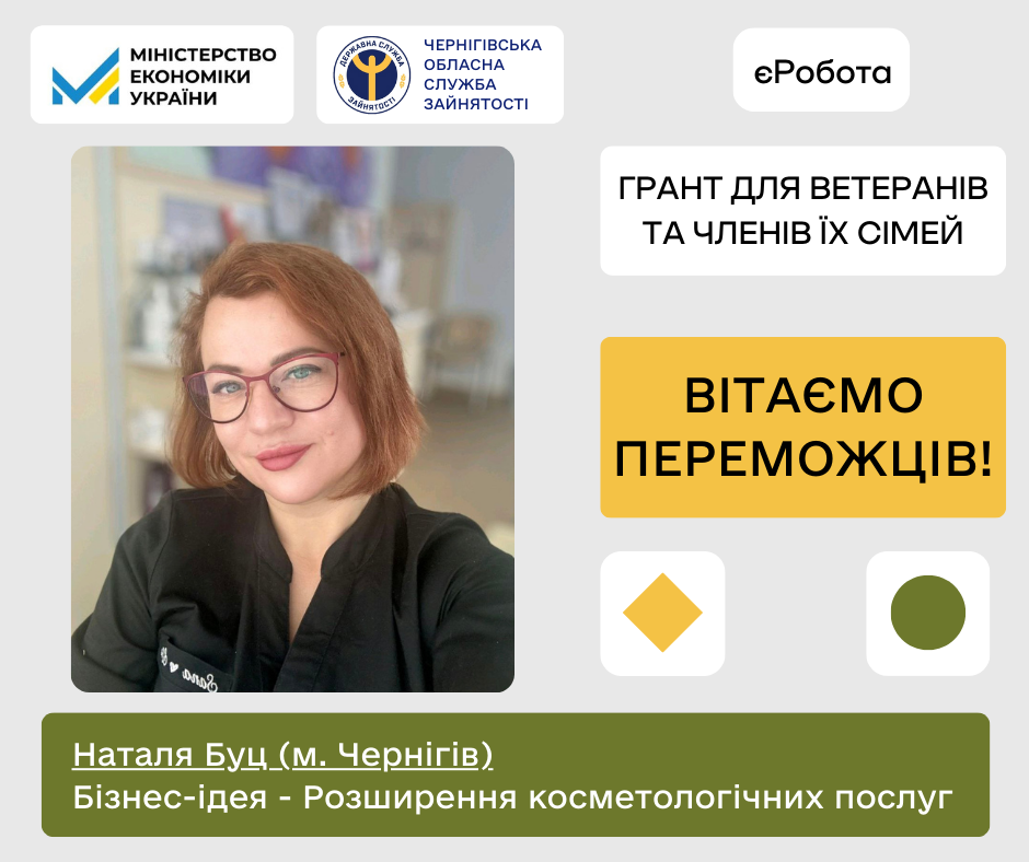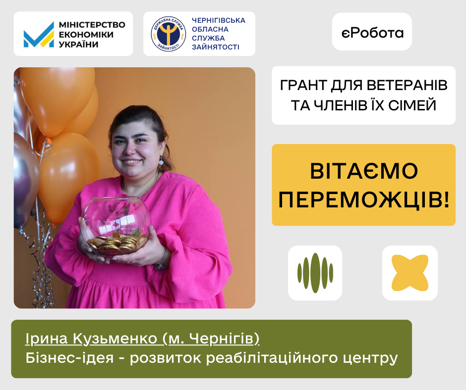 Перелік цьогорічних переможців за програмою «Грант для ветеранів та членів їх сімей» урядового проєкту «єРобота» на Чернігівщині, який до цього налічував 5 грантерів, поповнився ще трьома.