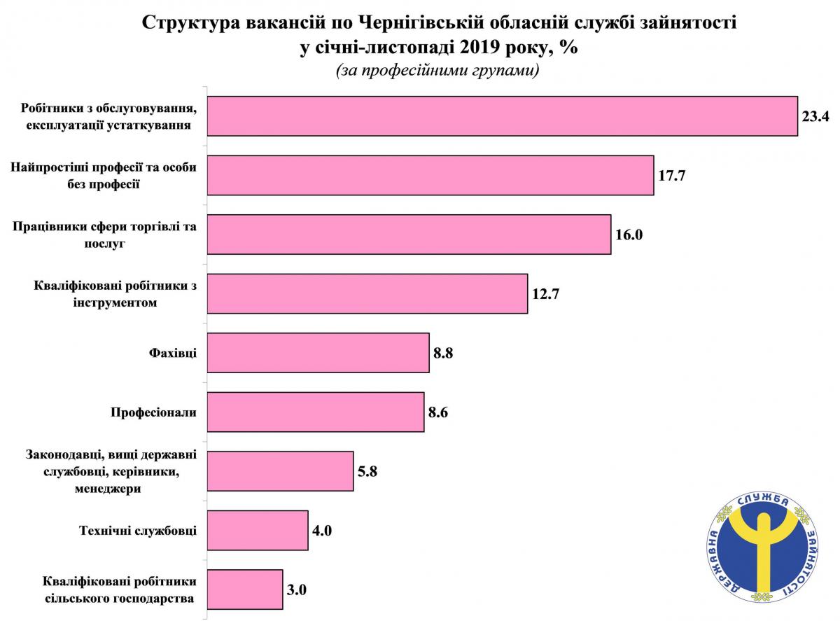 Найбільший попит роботодавців спостерігається на робітників з обслуговування, експлуатації та контролювання за роботою технологічного устаткування – це водії автотранспортних засобів, машиністи (кочегари) котельні, трактористи, оператори заправних станцій, дорожні робітники тощо. Також затребувані працівники сфери торгівлі і послуг – продавці, охоронники, кухарі, санітарки, соціальні робітники. Великим попитом у роботодавців користуються й кваліфіковані робітники з інструментом. Йдеться про слюсарів-ремонтників, швачок, електромонтерів, електрогазозварників, верстатників деревообробних верстатів, робітників з комплексного обслуговування й ремонту будинків.